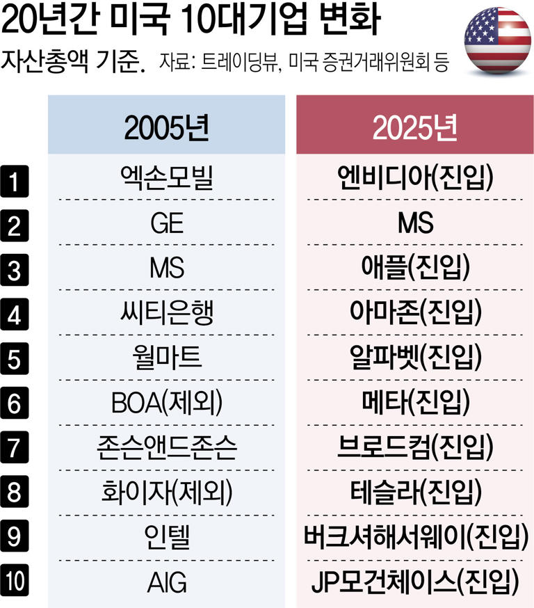 이는 안정적 성장의 측면에서는 긍정적으로 보일 수 있지만, 세계적인 흐름과 비교하면 정체 현상으로 해석될 수 있습니다. 미국의 경우 20년 전과 비교했을 때 상위 10대 기업 중 대부분이 교체되었습니다. 엔비디아, 알파벳(구글), 메타, 테슬라와 같은 기업은 신산업을 기반으로 단기간에 글로벌 리더 기업으로 성장했습니다.